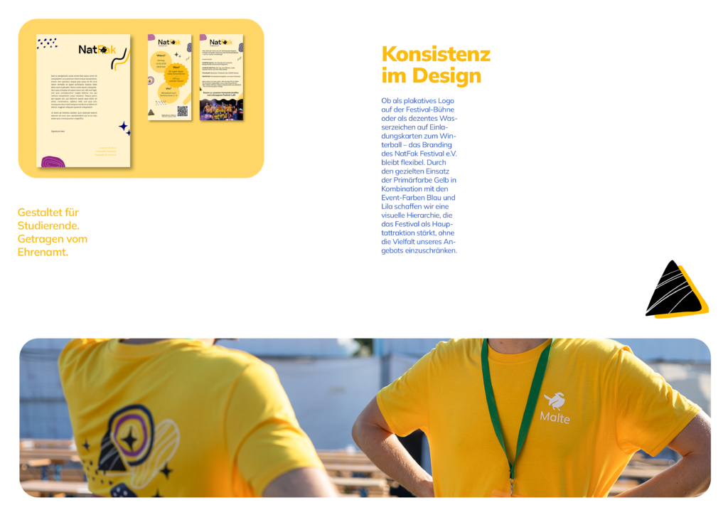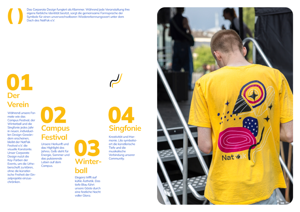 • Farbstrategie als Alleinstellungsmerkmal: Während Grün und Magenta die visuelle Landschaft der Region dominieren, setzt der NatFak e.V. auf eine Kombination aus Gelb, Blau und Lila. Diese Farben fungieren als Klammer: Sie vereinen die Identitäten der einzelnen Unter-Events (wie das Campus Festival oder die Singfonie) unter dem Dach des Vereins-Brandings.
